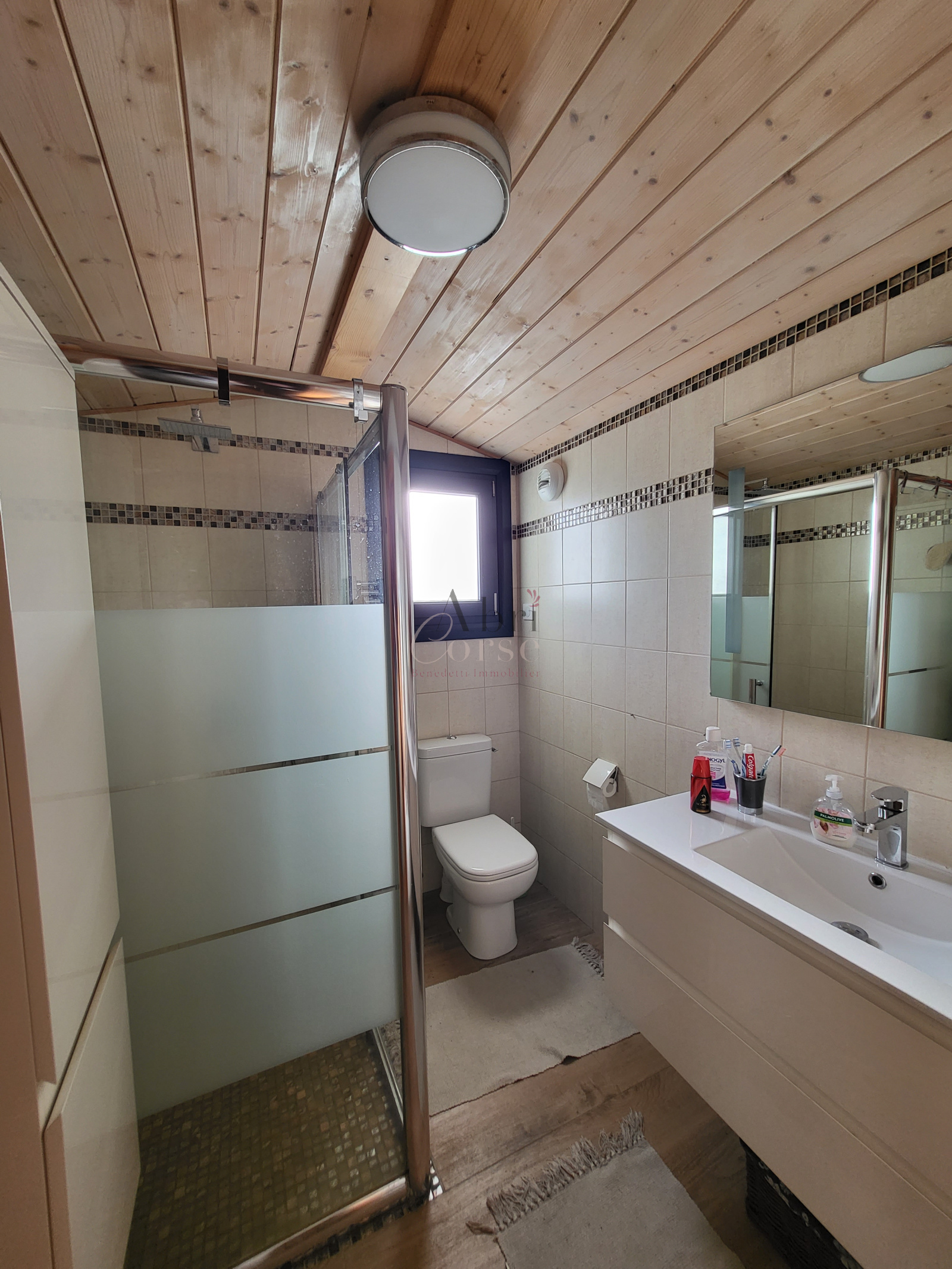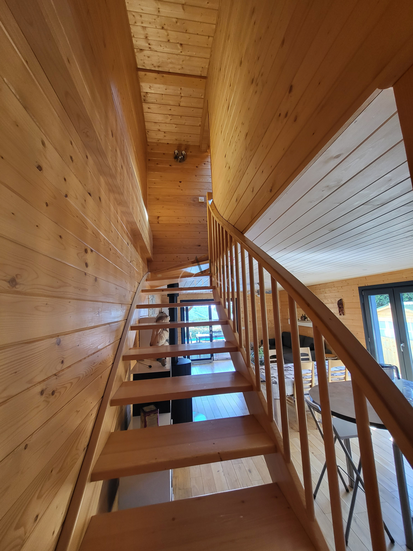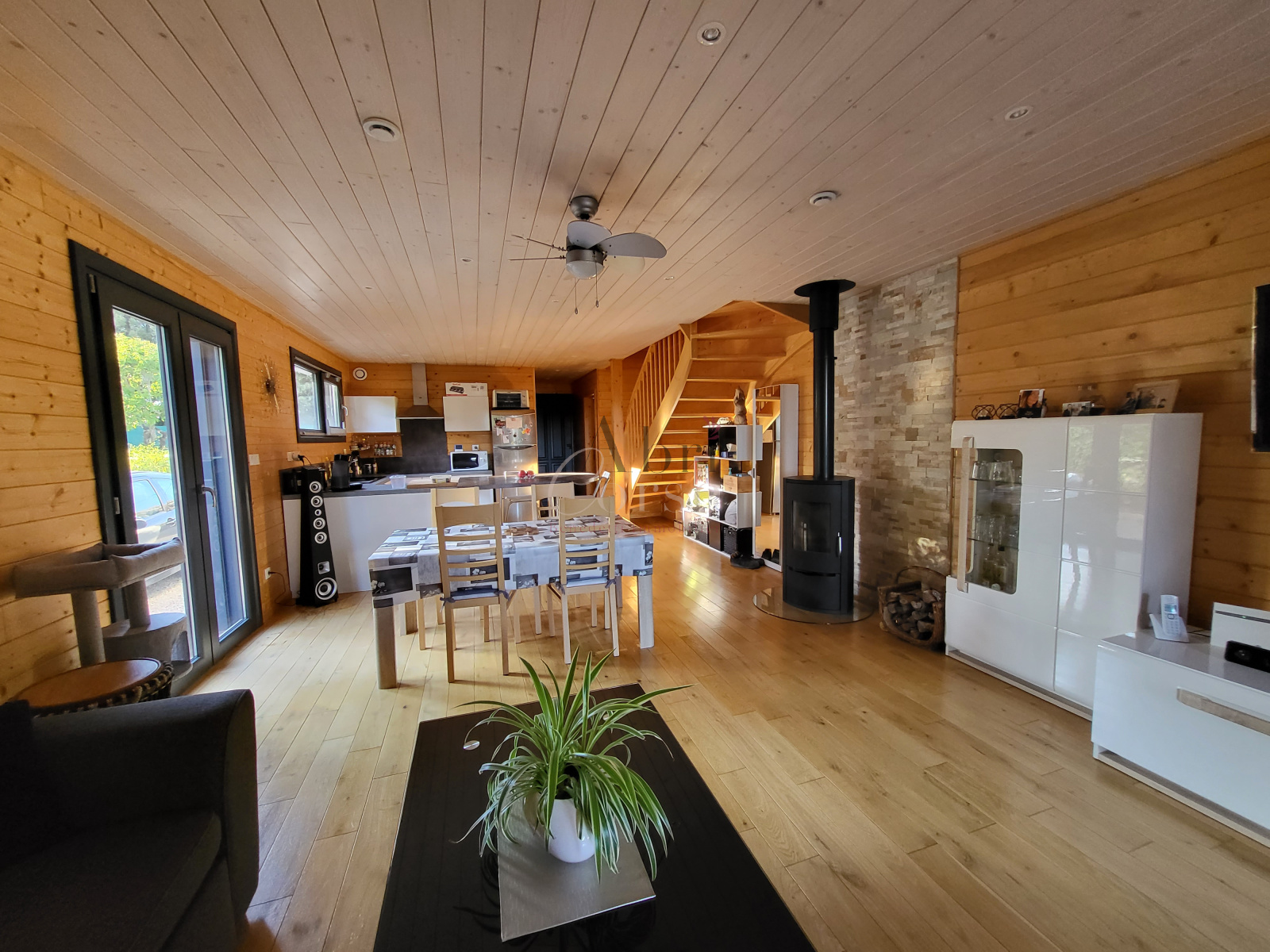 L'intérieur est composé d'un vaste salon salle à manger et son poele à bois , une cuisine équipée ouverte sur la pièce de vie. une buanderie, un WC séparé. A l'étage deux chambres mansardées (avec des rangements) une salle de douche (italienne) et son WC.